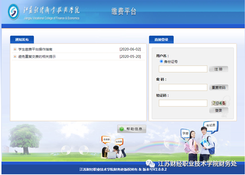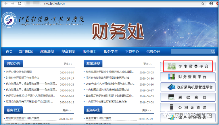 1.登录“学生缴费平台”,网址http://pay.jscj.edu.cn/payment/,或者登录江苏财经职业技术学院财务处主页http://cwc.jscj.edu.cn/,选择“学生缴费平台”。